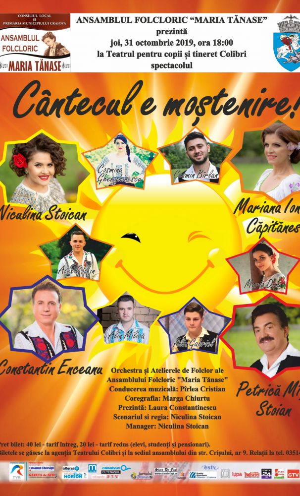Ansamblul Folcloric „Maria Tănase” vă așteaptă joi, 31 octombrie, de la ora 18:00, la Teatrul pentru copii şi tineret Colibri, la spectacolul “Cântecul e moștenire”. Vedetele ansamblului aduc alături de ei tineri frumoși și talentați cărora le insuflă dragostea și respectul pentru cântecul popular. NICULINA STOICAN, MARIANA IONESCU CĂPITĂNESCU, CONSTANTIN ENCEANU și PETRICĂ MÎȚU STOIAN vor fi în recital.