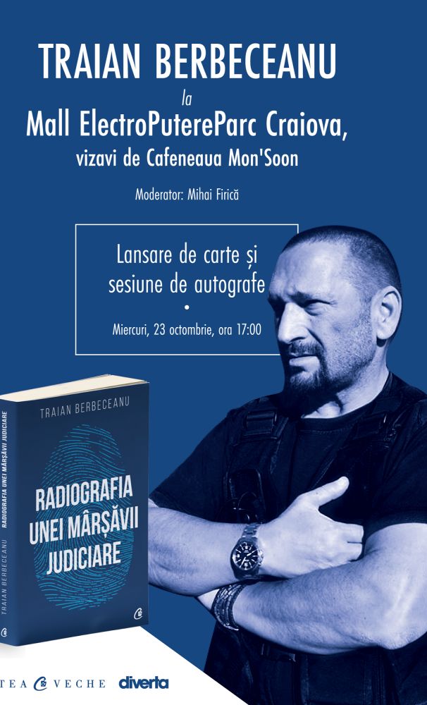 Curtea Veche Publishing, Librăriile Diverta și Mall ElectroPutereParc Craiova vă invită să aflați cum arată cealaltă parte a poveștii. Miercuri, 23 octombrie 2019, de la ora 17:00, Traian Berbeceanu își lansează bestsellerul „Radiografia unei mârșăvii judiciare” în Craiova.