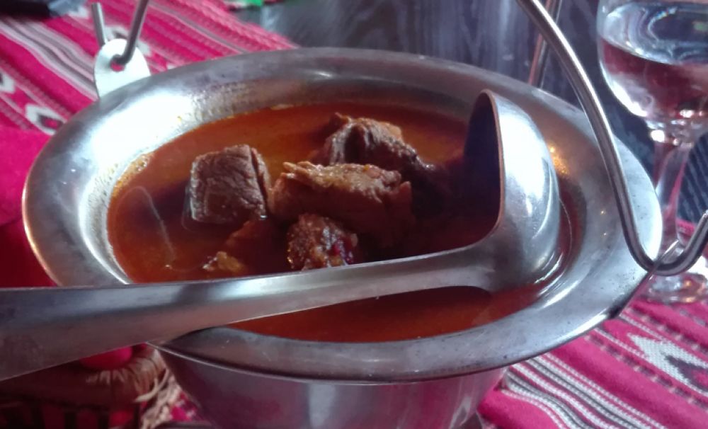 Am cerut un gulyas sau gulaș, o cafea și o apă. Imediat mi-a fost adusă cafeaua și apa. Am mai așteptat puțin și a venit și tradiționalul gulaș, frumos prezentat și servit în ceaun, cu polonic, pe trepied de metal. Servirea impecabilă, ospitalitatea la același nivel, iar atmosfera locului relaxantă. Mi-am pus primul polonic, de gust. Am rămas absolut înmărmurit! Anul trecut am fost în toată Harghita, iar anul acesta în Covasna, dar… asemena arome și mirosuri nu mi-au fost date să le cunosc până la Conacul lu’ Bebe. Am continuat să savurez gulașul și, în mintea mea, îi doream doar de bine bucătarului.