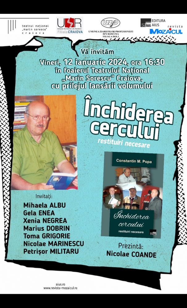 Profesorul și criticul literar Constantin M. Popa (1943-2016) va fi evocat de scriitori și colaboratori apropiați în cadrul evenimentului prilejuit de lansarea volumului de restituiri critice, “Închiderea cercului” (Ed. Aius 2023). Acesta va avea loc în foaierul Naționalului craiovean, vineri, 12 ianuarie, ora 16, 30. Vor susține alocuțiuni și vor prezenta figura cronicarului și a literatului scriitorii Xenia Negrea, Mihaela Albu, Gela Enea, Nicolae Marinescu, Marius Dobrin, Toma Grigorie, Nicolae Marinescu. Moderator al evenimentului, Nicolae Coande.