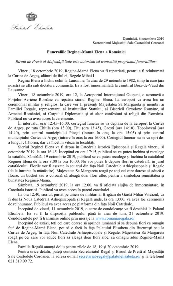 Familia Regală a României a anunțat doliu regal în zilele de 18, 19 și 20 octombrie 2019.