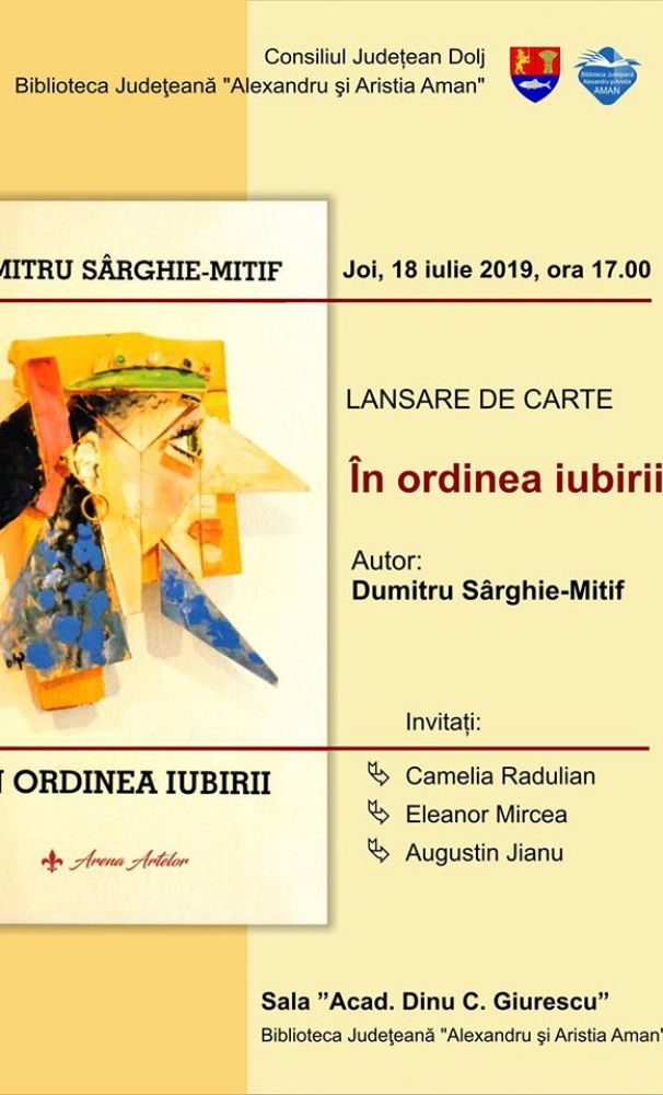 Scriitorul Dumitru Sârghie lansează volumul de versuri În ordinea iubirii joi, 18 iulie a.c., ora 17:00, în sala „Acad. Dinu C. Giurescu”, a Bibliotecii Județean Alexandru și Aristia Aman, din Craiova. Prolificul poet și jurnalist slătinean îi va alături pe rapsozii populari Ion Crețeanu și Cornel Popescu.