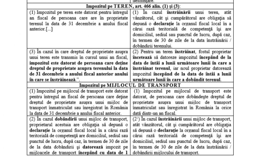 Situaţia comparativă a celor două reglementări, foarte diferite, cu privire la impozitul pe clădiri, pe teren, pe mijloacele de transport este prezentată în Anexa nr. 1/1.