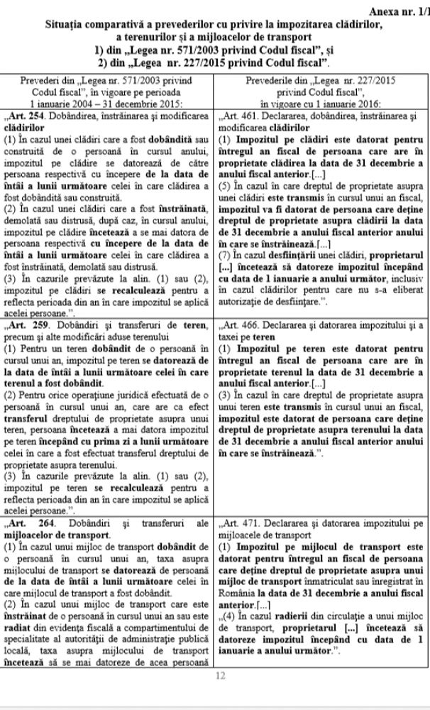 Anexa nr. 1/1. Situaţia comparativă a prevederilor cu privire la impozitarea clădirilor, a terenurilor și a mijloacelor de transport 1) din „Legea nr. 571/2003 privind Codul fiscal”, și 2) din „Legea nr. 227/2015 privind Codul fiscal”.