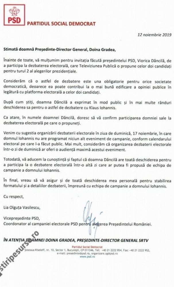 Conferința de presă a candidatului PSD la alegerile prezidențiale, Viorica Dăncilă, a fost difuzată, joi seara pe patru canale ale televiziunii publice: TVR 1, TVR 2, TVR 1 HD și TVR 2 HD. Prin contrast, conferința de presă a președintelui Klaus Iohannis, susținută miercuri, a fost difuzată doar pe TVR 1.