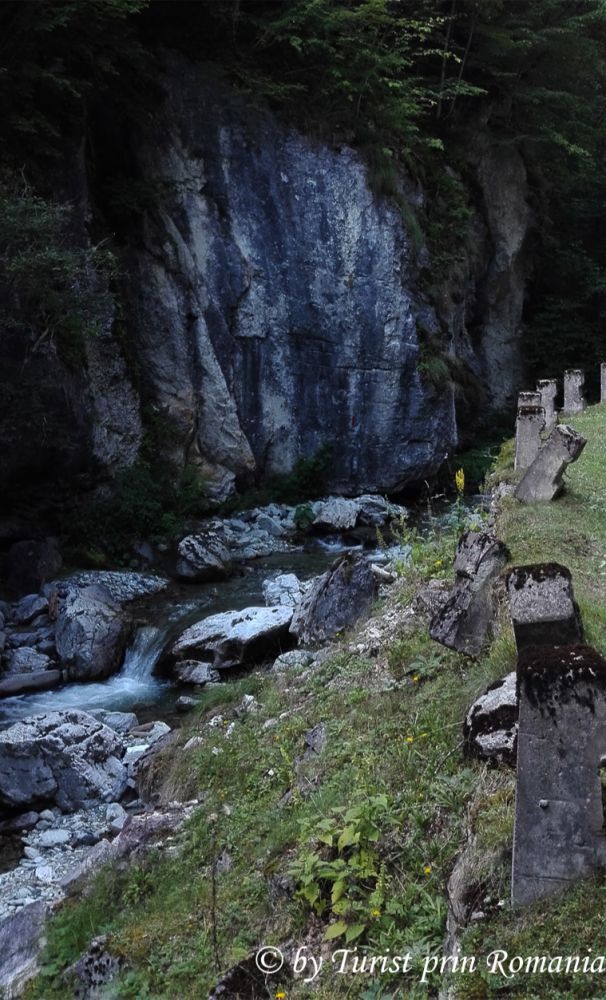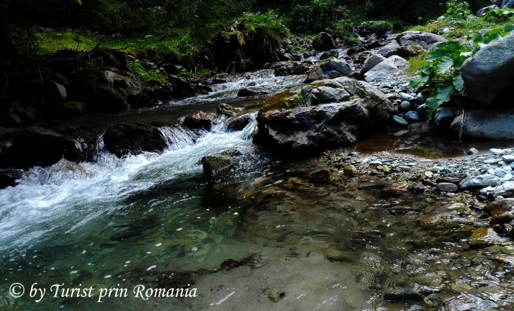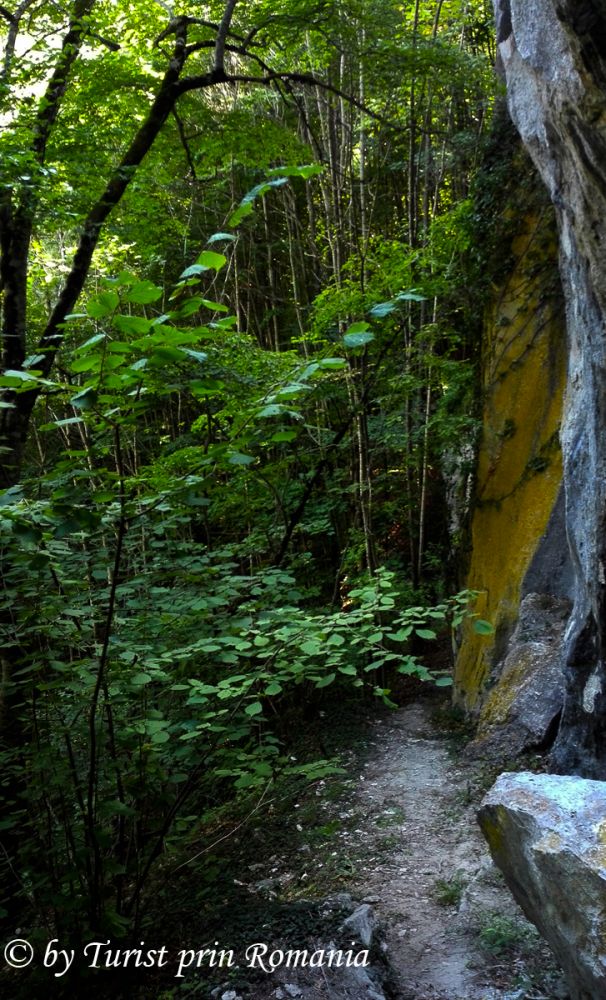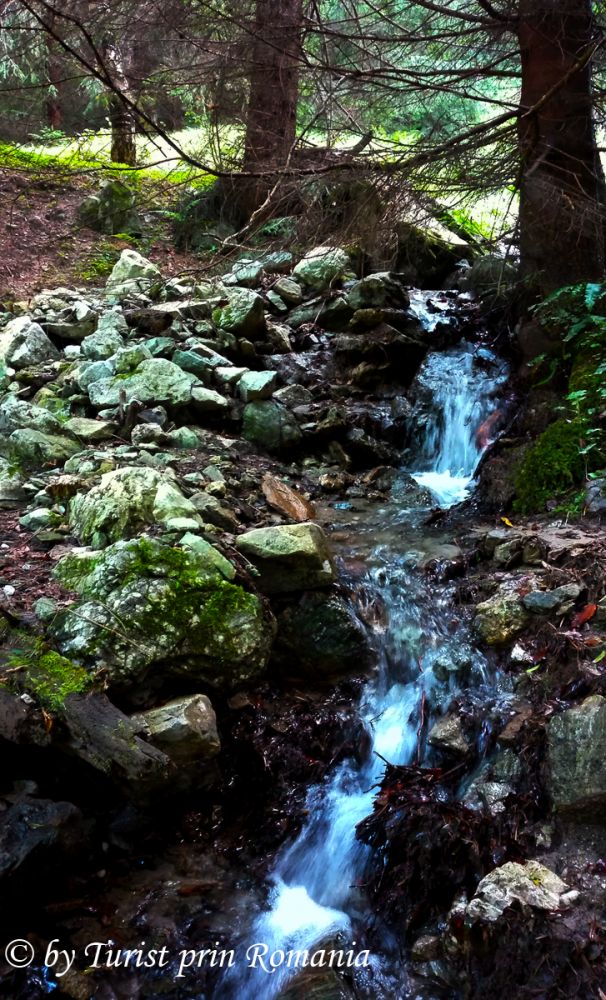 Lăsăm vagabondul (mașina) pe marginea drumului, trecem peste o apă rapidă de munte, aflată pe partea stângă și urmărim crucea albă. Începem să urcăm pieptiș, prin pădure. Slavă Domnului că nu a plouat de curând. Cărarea prin pădure, cu pante abrupte, plină de frunze și praf, ar fi devenit aproape imposibil de urcat. Urcăm preț de 30 de minute. Trecem de o cascadă în trepte, impresionantă, nenumită, nemarcată, care sparge liniştea pădurii de brazi într-un loc ascuns. În zona aceasta, natura este mai mult decât generoasă. Ploile și firavele izvoare creează astfel de cascade care, pentru ceva timp, se zbenguie și se aruncă nebune printre stânci, creând miracole efemere. În jurul nostru, pădurea își etalează frumusețea în toată splendoarea ei. Aerul acesta inconfundabil ne intră în plămâni și, ușor ușor, ne pregătim pentru o altă minune ce avea să ne dezvăluie tainele.