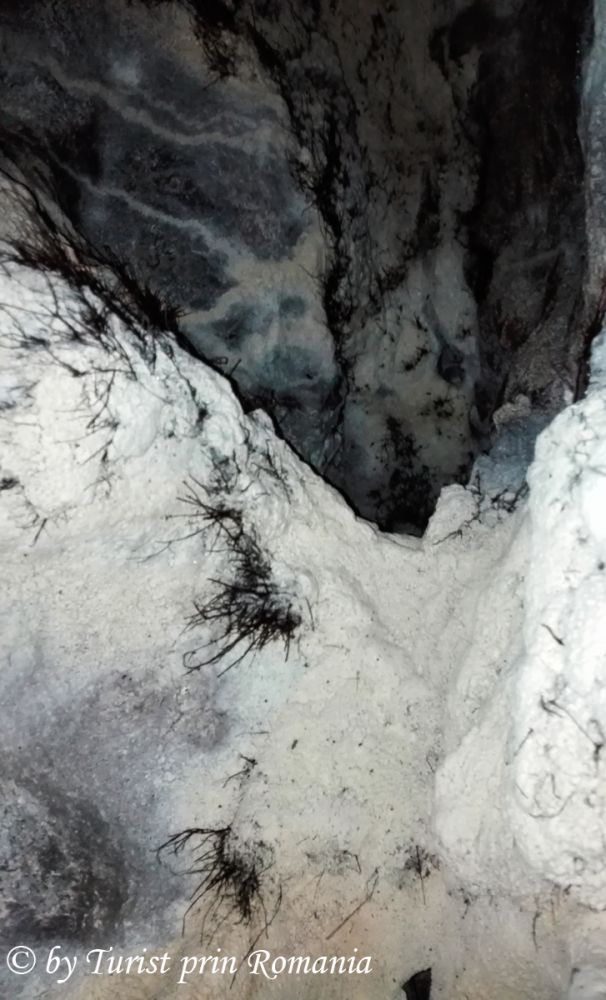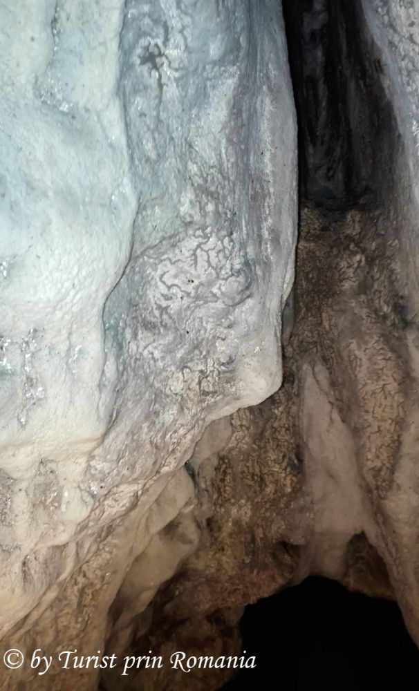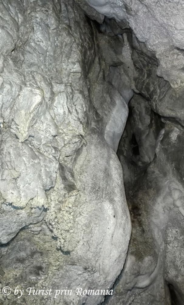 Aceasta este priveliștea de care am avut parte. Am intrat ghemuiți în peșteră. Podeaua alunecoasă ne făcea fiecare pas nesigur. Aerul umed ne intra în plămâni. Un liliac deranjat de lumina lanternei se izbește de picior, încercând să iasă din peșteră, se cuibărește în altă crăpătură a peșterii. Ne cerem scuze de deranj. Eram în casa lui, intruși. Privirile stăruiau însă pe pereții peșterii. Broderii diafane ornau pereții cu mii de broboane de apă și calcit. Străluceau ireal în lumina lanternei.