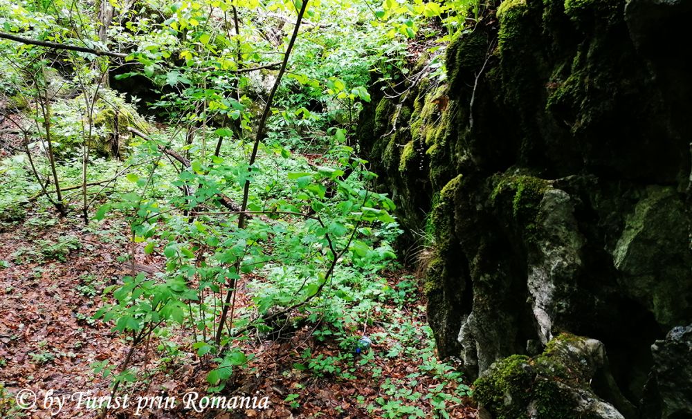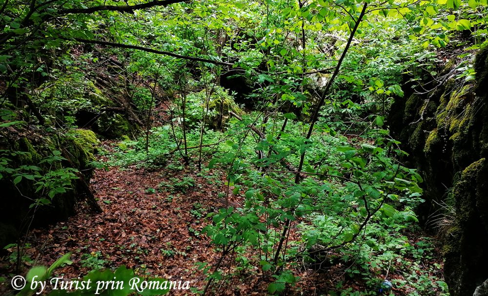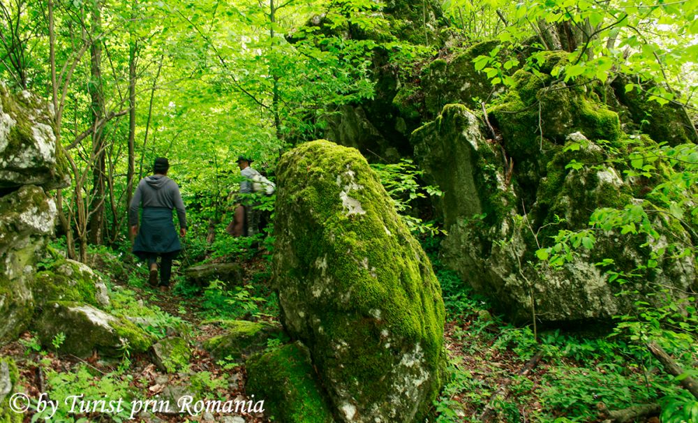 Traseul pornește apoi, pe sub platou, și se afundă în pădurea de fag pe potecă nemarcată. Recomandabil, pentru a evita situațiile neplăcute și nedorite, este ca acest traseu să fie făcut însoțit de ghid local. Pentru informații referitoare la ghidaj se poate afla cu încredere la Primăria Polovragi sau la Narcis Orzan, directorul Căminului Cultural din Polovragi. Traseul nostru continuă prin pădurea de fag, iar privirile pot cuprinde măreția și gigantismul copacilor. Trunchiuri drepte, unele năpădite de licheni, înalte de abia le poți vedea vârful și lăstăriș bogat și verde îți dau de veste că ai intrat pe teritoriul jidovilor.