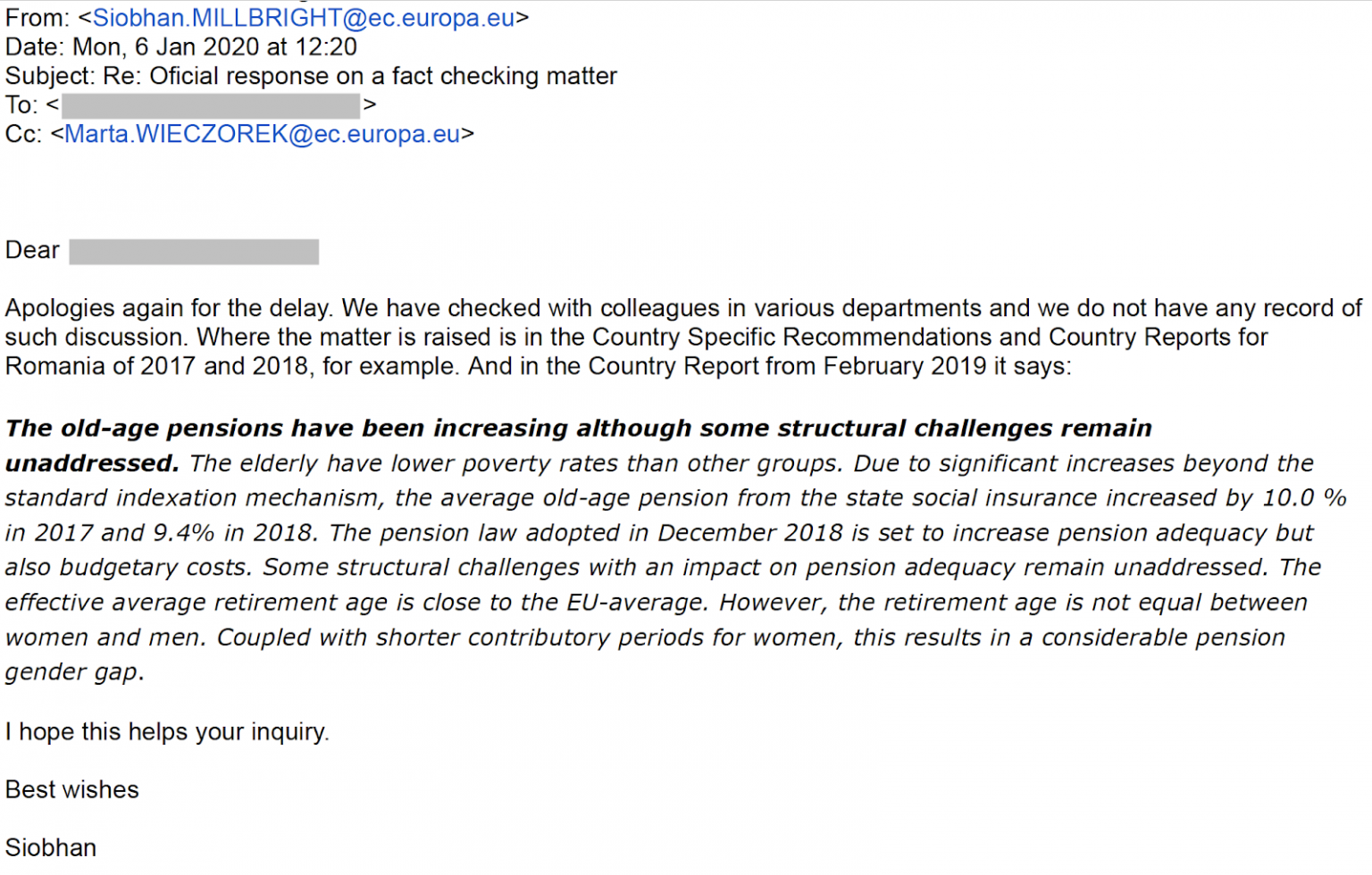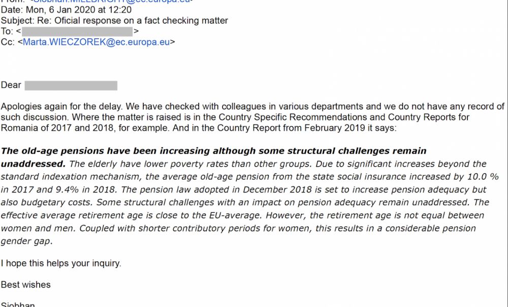 Comisia Europeană a precizat că nu i-a solicitat Liei Olguța Vasilescu să crească vârsta de pensionare și nici nu a existat vreo astfle de discuție. Așadar, Olguța Vasilescu minte cu nerușinare pe o temă sensibilă pentru sute de mii de români aflați în apropierea vârstei de pensionare: „Si mie mi s-a solicitat de la Comisia Europeana cresterea varstei de pensionare la 68 de ani. Am spus ca e imposibil, deoarece Romania are o speranta de viata cu 8 ani sub media Uniunii Europene. Noi suntem la 74, Franta la 82, de exemplu”. Așa cum se arată în răspunsul din email, a fost vorba doar de o încercare de a gasi o soluție pentru egalizarea vârstei de pensionare între femei și bărbați. În contextul în care Lia Olguța Vasilescu a răspândit tot felul de informații false potrivit cărora liberalii ar vrea ,,să taie pensiile,, ne dăm seama că pensionarii rămân ținta electorală dombardată cu fake-news produse de de Olguța. Nimic nou!