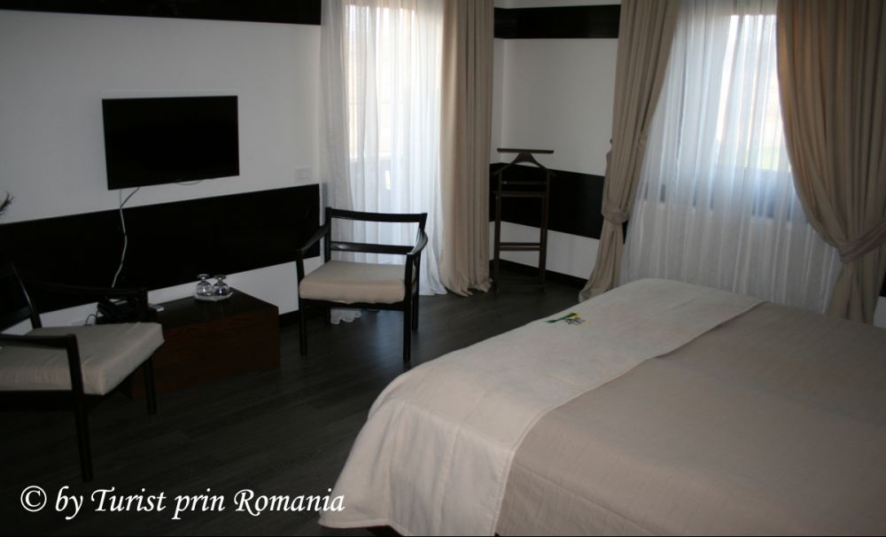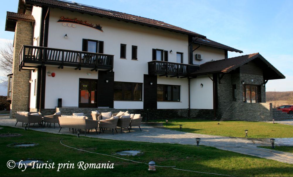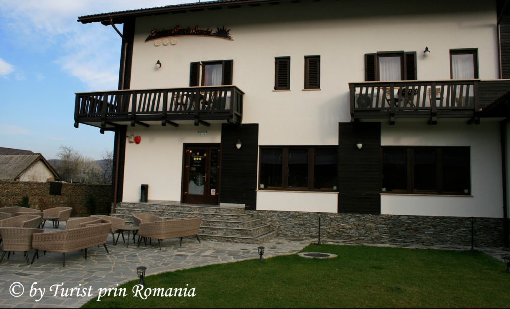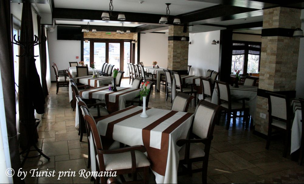 Am remarcat de pe treptele restaurantului o mică terasă neacoperită, înainte de intrarea la recepție, perfect încadrată între aleile perfect sculptate în gazon. Câteva mese cu fotolii din răchită îmbie la odihnă, reverie, relaxare sau meditație. Nu am apucat să intru bine în restaurant și am fost întâmpinat de personalul pensiunii, numai zâmbet și bunăvoință. Mesele frumos dispuse ale restaurantului, cu flori pe ele, cu fețe de masă impecabile, în partea stângă o cafenea cu mese joase și apoi barul din lemn masiv. Asta este prima imagine de cum pășești pragul.