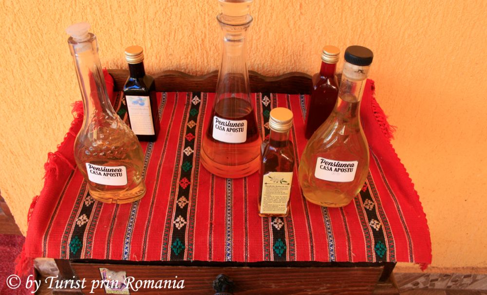 În foișor, pe o măsuță din lemn, decorată cu motive tradiționale, tronează cu respect produsele din fermă proprie ale familiei Apostu, gemuri, dulcețuri, țuici și alte băuturi alcoolice făcute aici. Ospitalitatea familiei Apostu, din punctul meu de vedere, nu cunoaște margini. Ar face totul în așa fel încât musafirii să se simtă mai bine ca acasă.