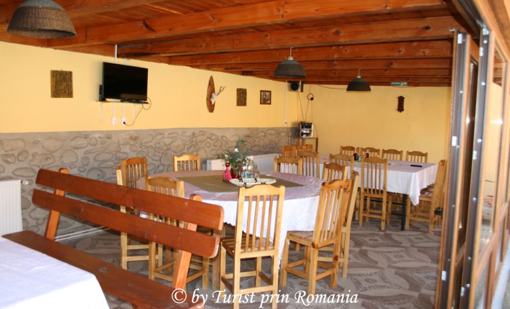 Cum am intrat în curte, pe partea stângă, o clădire din lemn, cu geamuri de sus până jos asigura salonul pentru servit masa. De la masă, puteai admira curtea frumos aranjată. Imediat după acest salon, un foișor acoperit, ca o terasă face legătura cu pensiunea propriu-zisă. În spatele foișorului, un cuptor cu grătar și rotisor, mândria domnului Apostu, stă liniștit și așteaptă să fie folosit pentru prepararea delicioaselor produse tradiționale pe care familia Apostu le pregătește cu tot sufletul.