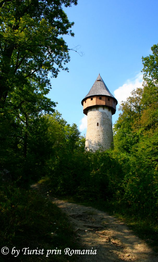 Am pășit înfrigurat și emoționat pe podețul ce trece pârâul Mare urcând către turn, pe potecă. După câteva zeci de metri am început să zăresc acoperișul, apoi balconul și cărămizile de sub balcon, urmând ca la final să pot admira măreția fortificației. O ușă mare din lemn masiv cu canaturi solide aștepta să fie deschisă. Am băgat ușor cheia în broască iar zgomotul făcut de mecanismul metalic parcă a spart liniștea din jurul turnului.