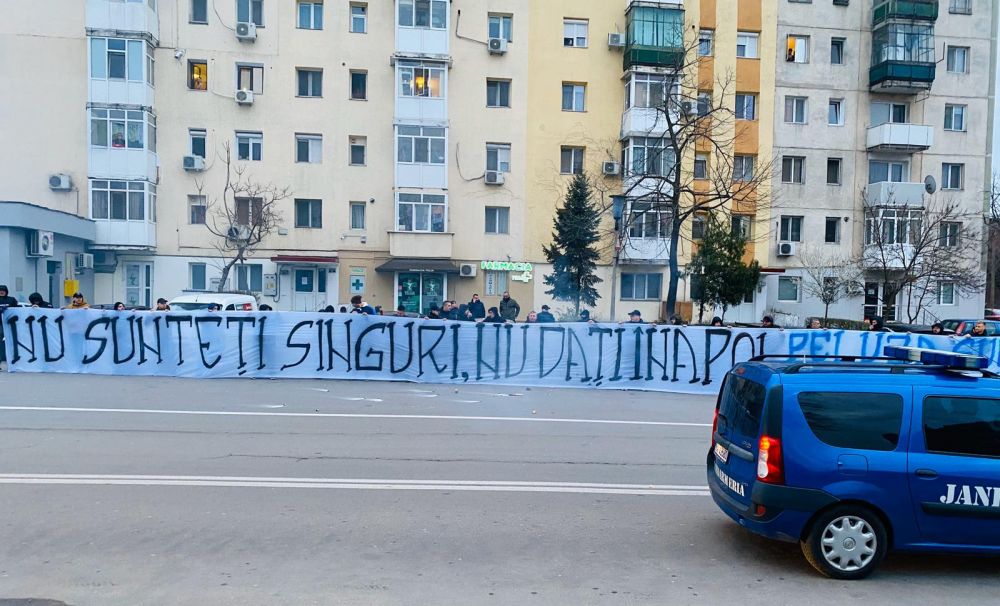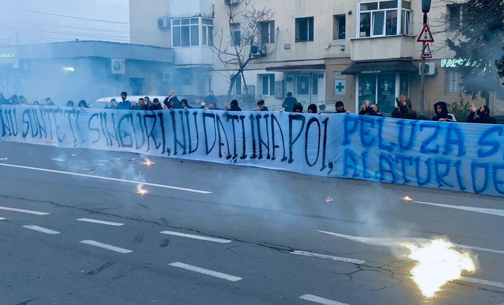 Suporterii craioveni au afișat un banner de mari dimensiuni: NU SUNTEȚI SINGURI, NU DAȚI ÎNAPOI! PELUZA SUD 97, ALĂTURI DE VOI!
