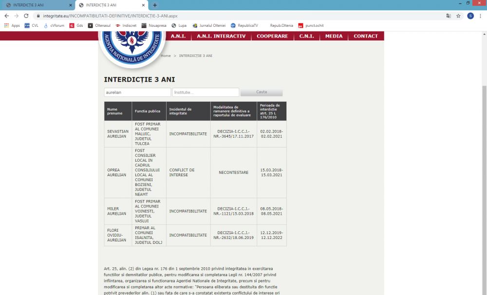 4. Flori Ovidiu Aurelian – fost primar al comunei Ișalnița, incompatibil, potrivit Deciziei ICCJ 2632/18.06.2018;