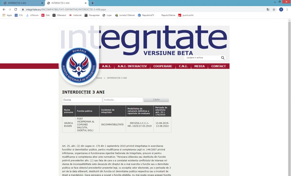 5. Giurcă Eugen – fost primar al comunei Sălcuța, incompatibil, potrivit Deciziei ICCJ 1652/27.03.2019;
