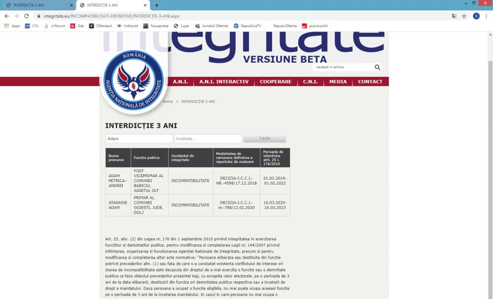 1. Adam Atanasie – fost primar al comunei Goiești, incompatibil, potrivit Deciziei ICCJ 788/12.02.2020;