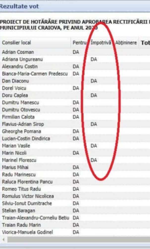 Consilierul liberal a prezentat și dovada că toți consilierii PNL au votat împotriva propunerii primarului genoiu și doar PSD-iștii au votat aberanta inițiativă: Adriana Ungureanu, Doru Câplea, Dan Diaconu, Marinel Florescu, Marian Vasile și Flavius Sirop (vezi imaginea).
