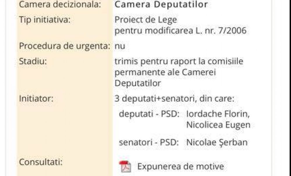 Proietul de lege „pentru completarea Legii nr.7/2006 privind statutul functionarului public parlamentar” a fost depus de celebrii pesedisti Florin Iordache, Eugen Nicolicea si Serban Nicolae.