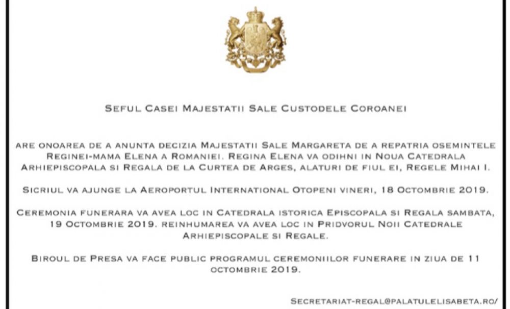 Ultimul reprezentant al Dinastiei române care fusese înmormântat în afara țării, Regina Elena a României, va odihni lângă Regele Mihai I, fiul său, și lângă celelalte capete încoronate ale României la Curtea de Argeș. Potrivit unui comunicat de presă, Şeful Casei Majestăţii Sale Custodelui Coroanei are onoarea de a anunţa decizia Majestăţii Sale Margareta de a repatria osemintele Reginei-mamă Elena a României. Regina Elena va odihni în Noua Catedrală Arhiepiscopală şi Regală de la Curtea de Argeş, alături de fiul ei, Regele Mihai I. Sicriul va ajunge la Aeroportul Internaţional Otopeni vineri, 18 octombrie 2019.