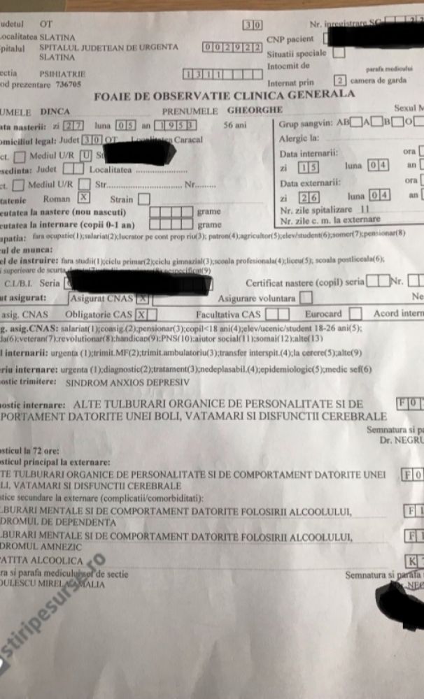 Se conturează profilul unui criminal care a comis crimele din cauza nebuniei. Ghorghe Dincă a fost internat timp de 11 zile, în aprilie 2010, la secția de psihiatrie a Spitalului Județean de Urgență Slatina (Olt), potrivit unui document medical publicat de ȘTIRIPESURSE.RO. Criminalul a fost internat pentru tratament, la trimiterea medicului de familie.