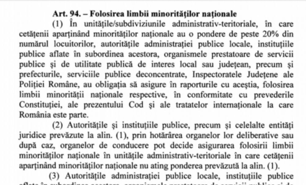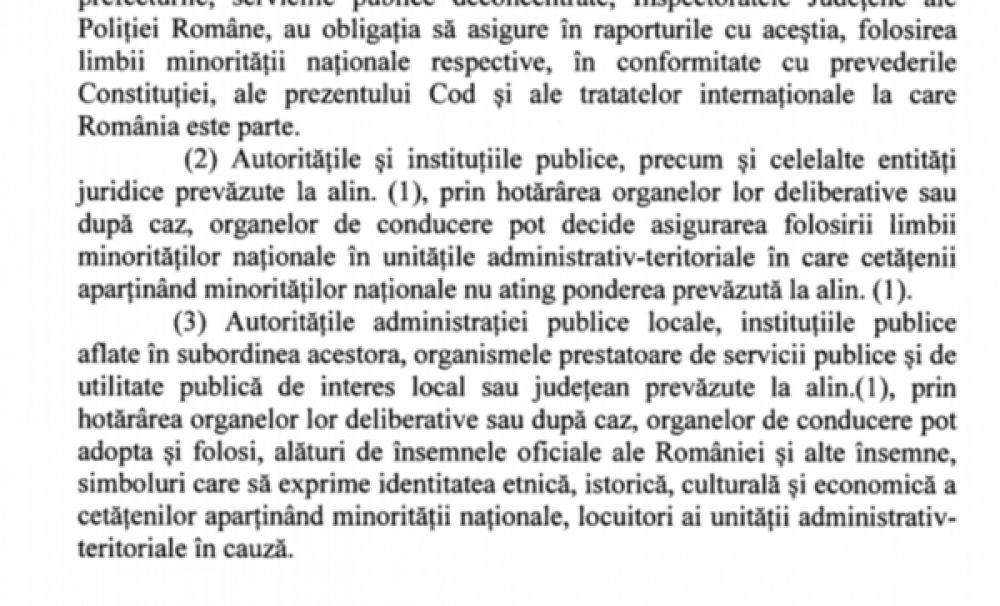 Proiectul, asumat de toţi parlamentarii UDMR, care vizează modificarea Codului Administrativ, a fost înregistrat la Senat în toamna anului trecut. În Senat, PSD are majoritate simplă, fără a mai fi nevoit să apeleze la diverși aliați, ceea ce arată cine face jocurile. Articolul 94 din proiectul legislativ e dedicat folosirii limbii minorităţilor naţionale.